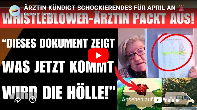 Allgemein ÄRZTIN KÜNDIGT SCHOCKIERENDES FÜR APRIL AN 🚨 „DAS SIND RITUALE! ACHTEN SIE AUF DIE LIEFERWAGEN!“ Uwe 21. April 2026 Continue Reading Previous Wer Auto fährt, ist reich genug? Wut über Arroganz der Chef-Wirtschaftsweisen im GEZ-TVNext Michael Hudson: Den globalen Finanzwinter hinauszögern – aber wie lange noch?