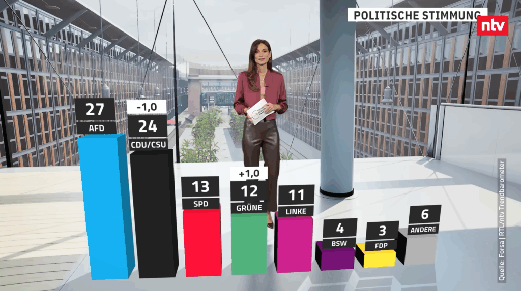 Allgemein AfD erreicht Rekord-Vorsprung vor Union, Zufriedenheit mit Merz am Tiefpunkt Uwe 1. Oktober 2025 Continue Reading Previous Bienengift in der Naturmedizin: Kleine Dosis, große WirkungNext Dieselskandal: DUH will nach Urteil acht Millionen Diesel stilllegen lassen