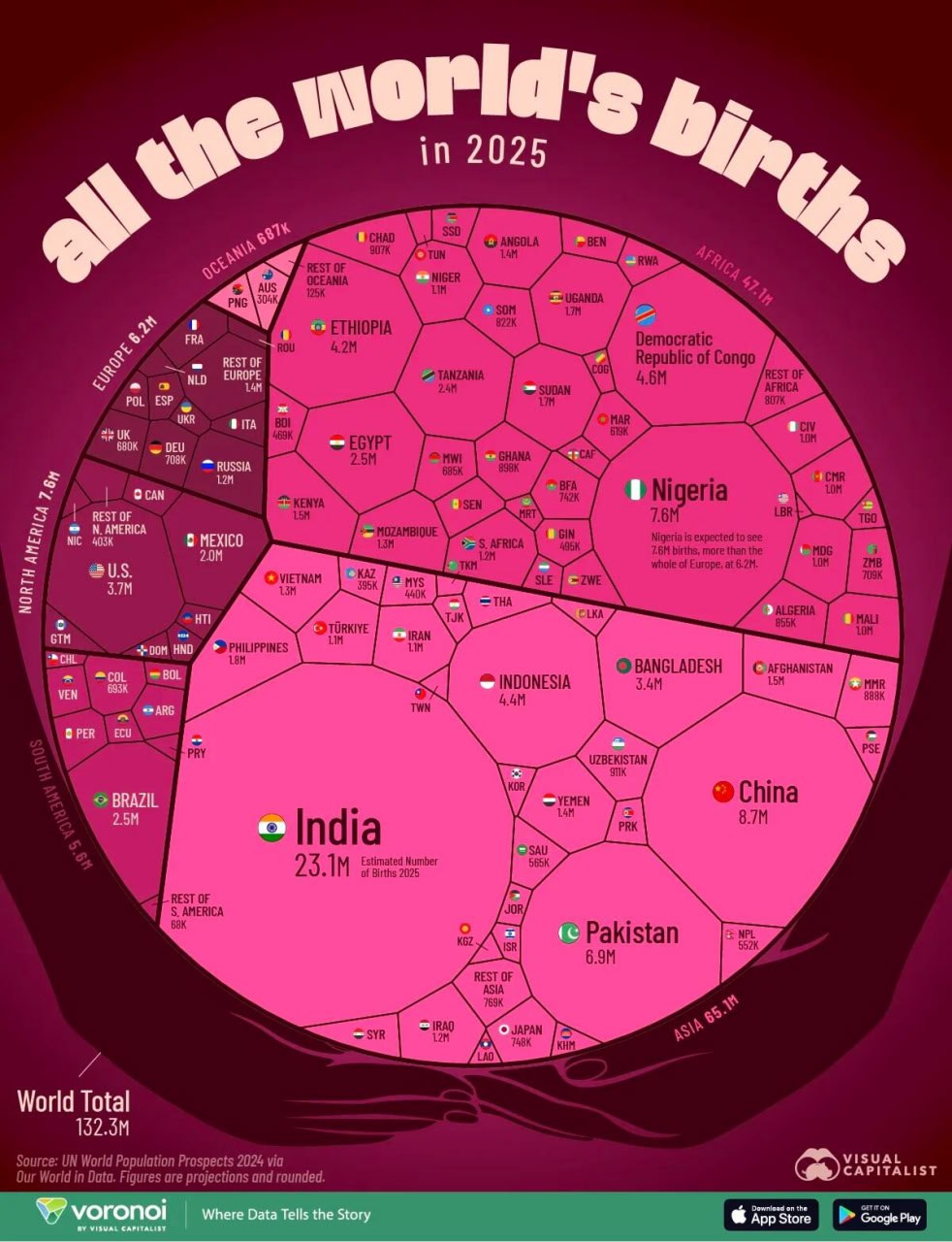 🇨🇳 China folgt mit rund 8,7 Millionen Geburten, trotz seit Jahrzehnten sinkender Geburtenrate. Weitere wichtige Beitragsländer sind 🇵🇰 Pakistan, 🇧🇩 Bangladesch und 🇮🇩 Indonesien, was die anhaltende demografische Bedeutung Asiens unterstreicht.
