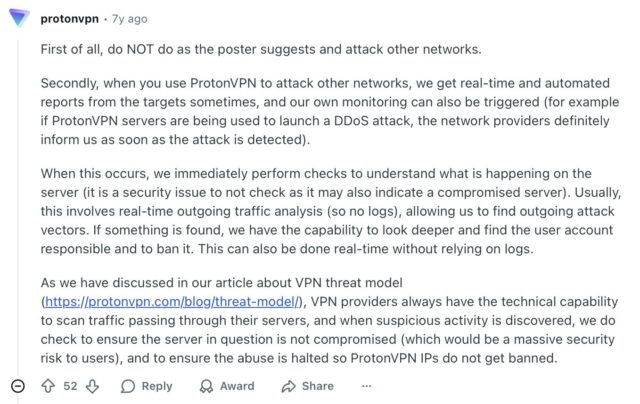 Und dennoch gab Proton hinter den Kulissen zu, dass sie, wenn sie es für gerechtfertigt halten, beobachten können, was Sie tun. Sie können Aktivitäten protokollieren. Sie können Ihr Verhalten „vorwegnehmen“.