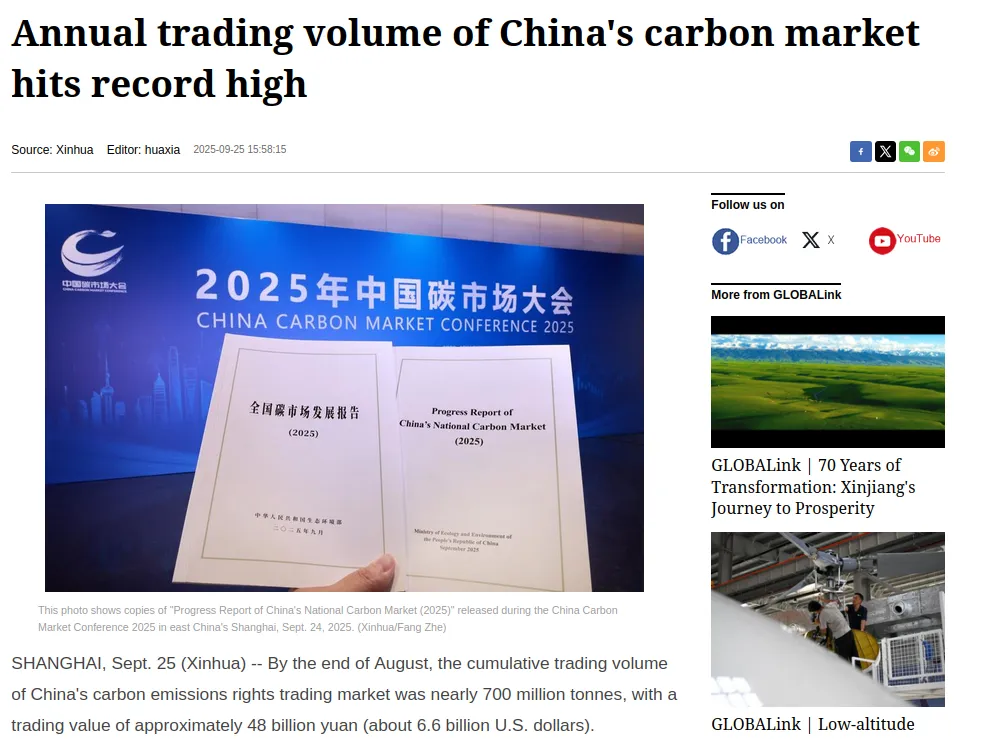 Die Nachrichtenagentur Xinhua berichtete über die Höhepunkte der China Carbon Market Conference, die Ende September in Shanghai stattfand: