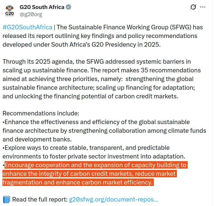 Unterdessen arbeitet Südafrika mit der Arbeitsgruppe für nachhaltige Finanzierung der G20 zusammen, um „die Integrität der Kohlenstoffkreditmärkte zu verbessern, die Marktfragmentierung zu verringern und die Effizienz des Kohlenstoffmarktes zu steigern“.