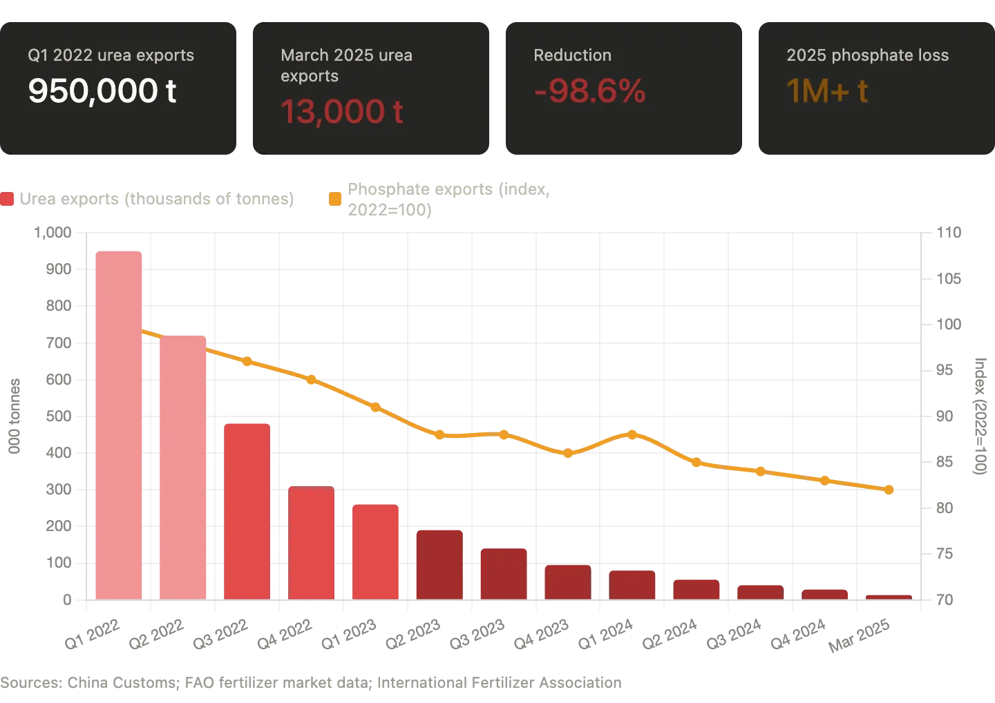 Doch die Zahlen zeichnen ein anderes Bild vom Ausmaß der Geschehnisse. In den ersten drei Monaten des Jahres 2022 exportierte China 950.000 Tonnen Harnstoff. Bis März 2025 war diese Zahl auf 13.000 Tonnen eingebrochen – ein Rückgang um mehr als 98 Prozent. Allein im Jahr 2025 sanken die Phosphat-Exporte um 18 Prozent, was einem Verlust von mehr als einer Million Tonnen entspricht.