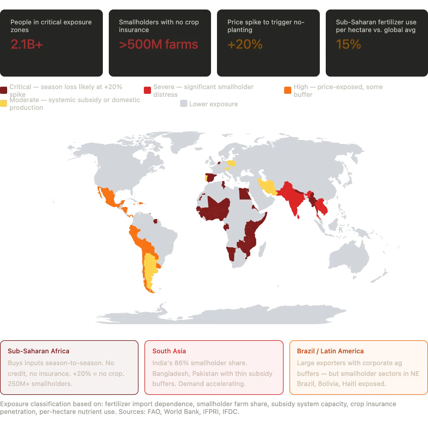 Der Düngemittelpreisindex der Weltbank stieg im Jahr 2025 um mehr als 20 Prozent. Prognosen deuten auf eine leichte Entspannung im Jahr 2026 hin – doch diese Prognosen stammen aus der Zeit vor dem aktuellen Stopp der Stickstoff- und Kaliumlieferungen, der Blockade der Straße von Hormus und den sich verstärkenden Auswirkungen der anhaltenden chinesischen Exportbeschränkungen. Zusammenfassend bedeutet dies, dass 2,1 Milliarden Menschen in kritischen Risikozonen leben.