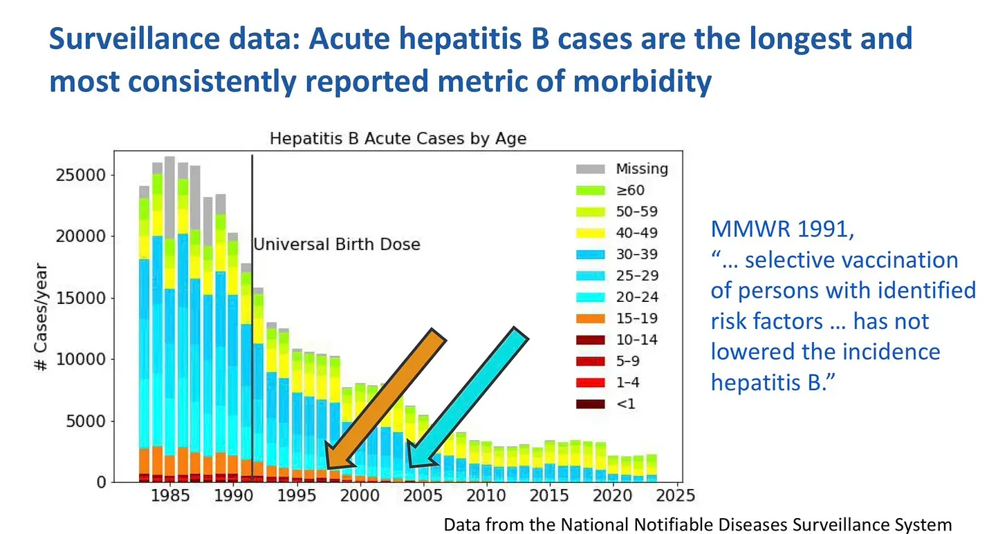 Der Rückgang der Hepatitis-B-Erkrankungen trat ein, bevor die geimpften Kohorten alt genug waren, um dies zu erklären. Der gleiche Rückgang trat auch bei Hepatitis C auf – für die es keinen Impfstoff gab. Aber diese Daten werden immer noch verwendet, um die Impfung von Neugeborenen gegen Hepatitis B zu rechtfertigen. Das ist reiner Wahnsinn.