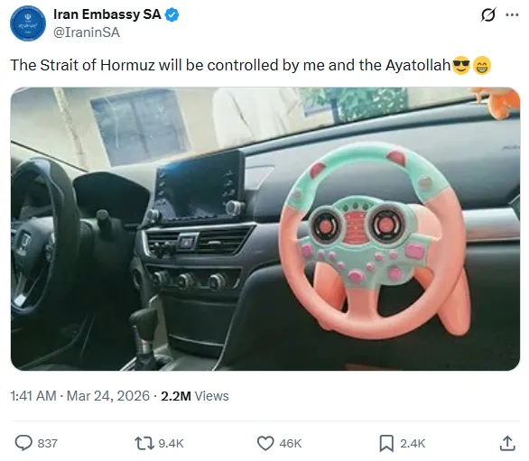 Noch erstaunlicher ist, dass Trump diesen Plan zumindest teilweise zu bestätigen scheint, indem er gestern, unmittelbar nachdem er von seinem Ultimatum zurückgetreten war, erklärte, dass er sich vorstelle, dass die Straße von Hormus „von mir und dem Ayatollah gemeinsam kontrolliert“ wird. Zur Belustigung der iranischen Diplomatie.