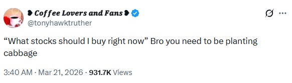 Der Aktienmarkt ist tatsächlich gefallen (der S&P500 fiel um bis zu -5 %, fast ausschließlich aufgrund des Iran-Krieges), aber das sollte im Moment die geringste Sorge der Menschen sein…