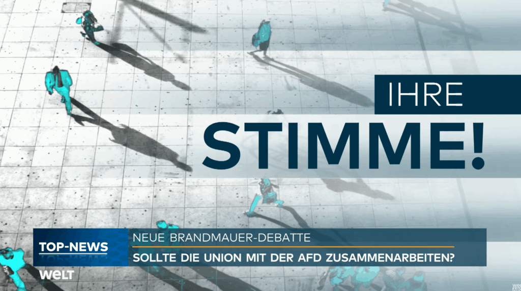 Allgemein DEUTSCHLAND: Brisante Brandmauer-Diskussion! Sollten CDU, CSU und AfD gemeinsame Sache machen? Uwe 17. Oktober 2025 Continue Reading Previous DEUTSCHLAND: Rede von AfD-Weidel? „Die sagt einen Satz nach dem anderen – und jeder stimmt“ – JörgesNext MACRON AM ENDE! Le Pen stellt ein ULTIMATUM: „NEUWAHLEN ODER CHAOS!“