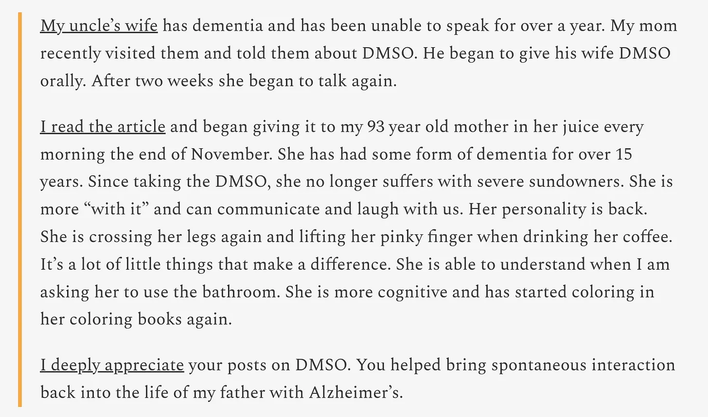 Es ist eine der bemerkenswertesten und am meisten unterdrückten Verbindungen in der Medizingeschichte. DMSO ist dafür bekannt, Hirnverletzungen zu heilen, Entzündungen zu reduzieren, sterbende Neuronen zu retten und das Gedächtnis zu verbessern. Seit Jahrzehnten gibt es Studien, die die Vorteile von DMSO bei Demenz belegen.