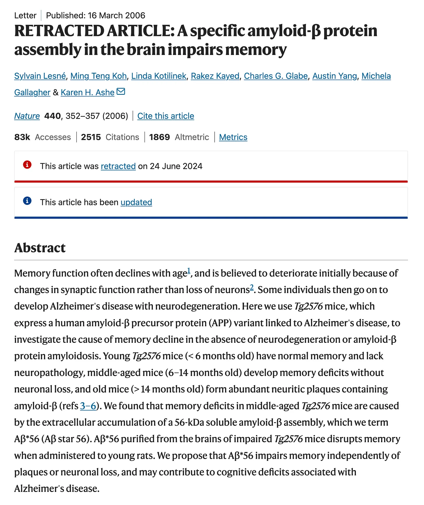 Ein Artikel in Nature verkündete, dass sie den entscheidenden Beweis gefunden hätten. Er wurde zu einer der meistzitierten Alzheimer-Studien aller Zeiten. Die Autoren wurden zu Stars. Die Pharmaindustrie investierte erneut Milliarden in die Suche nach einem neuen chemischen Bösewicht.