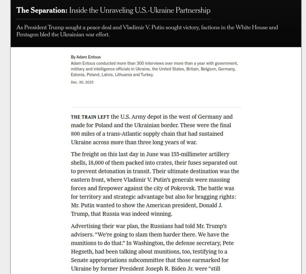 In ihrem Artikel „Die Trennung: Im Inneren der zerfallenden US-Ukraine-Partnerschaft” gibt die NYT zu, dass die USA, während sie vorgaben, Frieden anzustreben, heimlich „verstärkte” Angriffe auf Russland selbst durchgeführt haben.