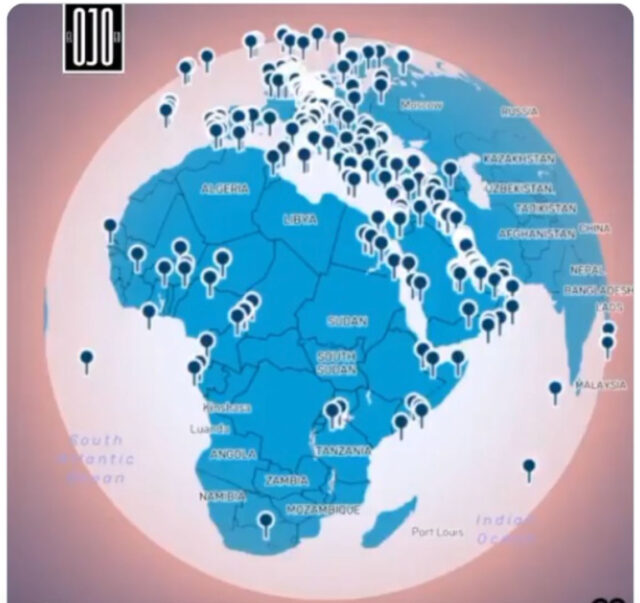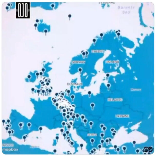 Die Bilder stammen aus einem XTwitter-Video (zum Link klicken). Jede Markierung steht für einen US-Militärstützpunkt, die Darstellung ist jedoch nicht maßstabsgetreu, daher sind die geografischen Standorte nicht exakt. Eine alternative Version finden Sie im YouTube-Video „ The US Military is EVERYWHERE“ .