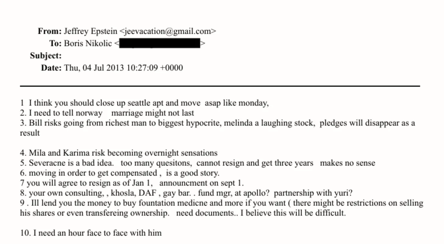 4. Juli 2013 – Epstein erstellt ein privates strategisches Memo, in dem er Gates’ Schwachstellen bewertet. Punkt 3: „Bill läuft Gefahr, vom reichsten Mann zum größten Heuchler zu werden, Melinda zur Lachnummer, und die Spendenzusagen werden infolgedessen verschwinden.“ Punkt 4: „Mila und Karima laufen Gefahr, über Nacht zu Sensationen zu werden.“ Zwei Frauen werden namentlich genannt. Die „Spendenzusagen“ sind der Giving Pledge – die moralische Architektur hinter dem gesamten philanthropischen Ökosystem der Gates. (EFTA00964598)