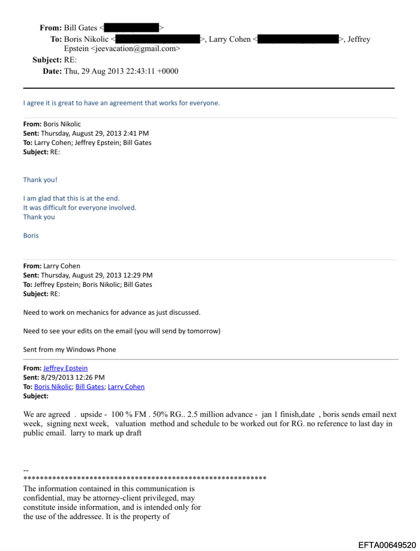29. August 2013 — Gates antwortet auf einen E-Mail-Verlauf mit Epstein, Boris Nikolic und Larry Cohen: „Ich stimme zu, dass es großartig ist, eine Vereinbarung zu haben, die für alle funktioniert.“ Die E-Mail bestätigte eine Vereinbarung, die 100 % von Boris’ Gewinnanteilen an Foundation Medicine, 50 % seiner Gewinnanteile an ResearchGate und einen Barvorschuss von 2,5 Millionen Dollar umfasste – mit der Anweisung „kein Hinweis auf den letzten Tag in öffentlichen E-Mails“. Foundation Medicine ging zweiundzwanzig Tage später an die Börse. (EFTA00649520, EFTA01957143)
