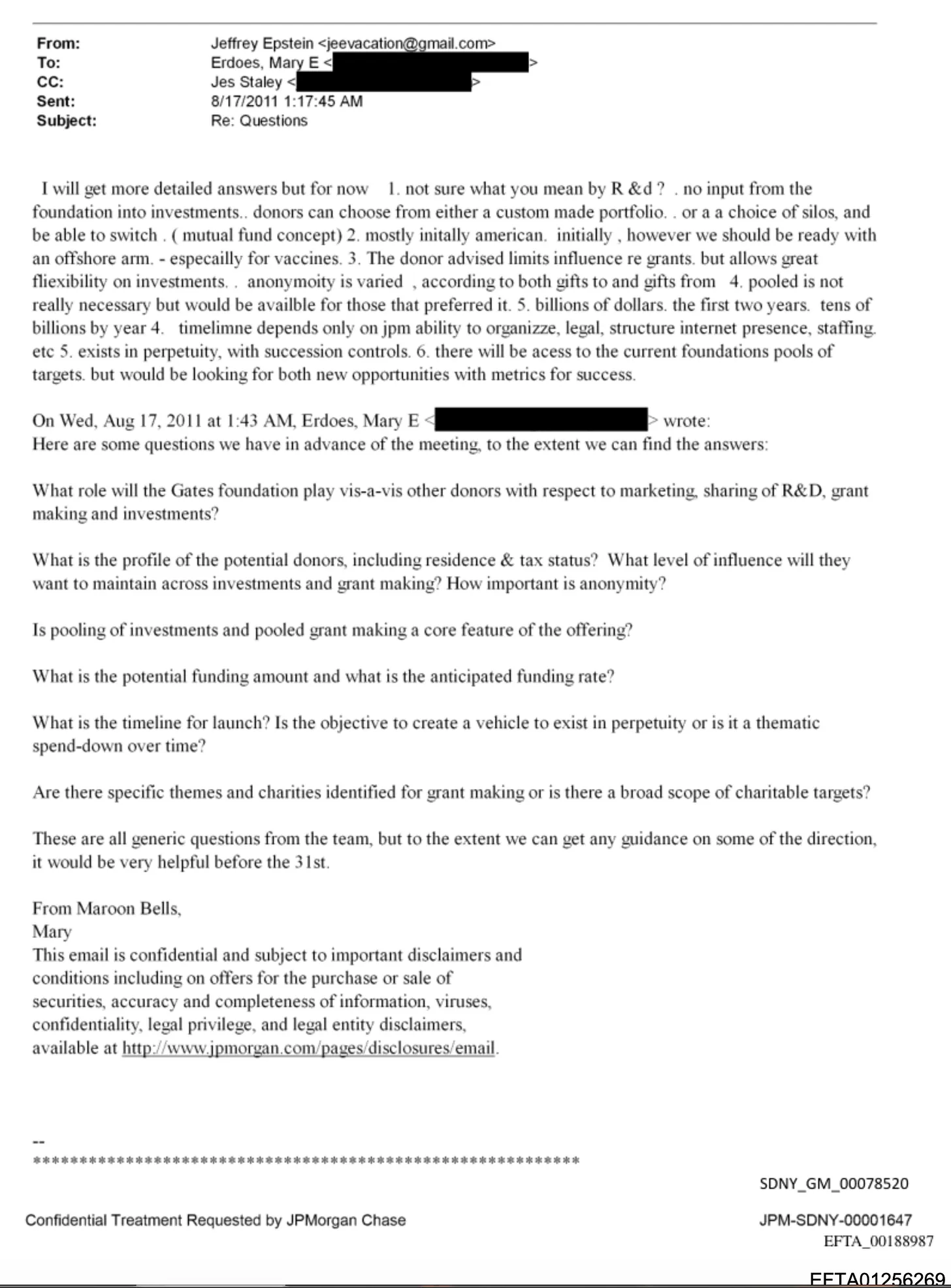 Das Projekt „Molecule“ – ein 14-seitiger Vorschlag für einen Spenderberatungsfonds, der 2011 zwischen JPMorgan, Gates’ Umfeld und Epsteins E-Mails zirkulierte – sah eine Struktur aus drei Einheiten mit unbefristeter Laufzeit, Anonymität der Spender und Offshore-Zweigstellen für Impfstoffinvestitionen vor. Zu dem vorgeschlagenen Lenkungsausschuss gehörten Warren Buffett, Melinda Gates, Susan Rice, Seth Berkley von Gavi und Königin Rania von Jordanien. Das Budget sah 20 Millionen Dollar zur „Finanzierung des Überwachungsnetzwerks in Pakistan“ vor. Epstein prognostizierte, dass der Fonds in den ersten zwei Jahren „Milliarden von Dollar“ und „bis zum vierten Jahr Dutzende von Milliarden“ generieren würde. (SDNY_GM_00078533, EFTA01256269)