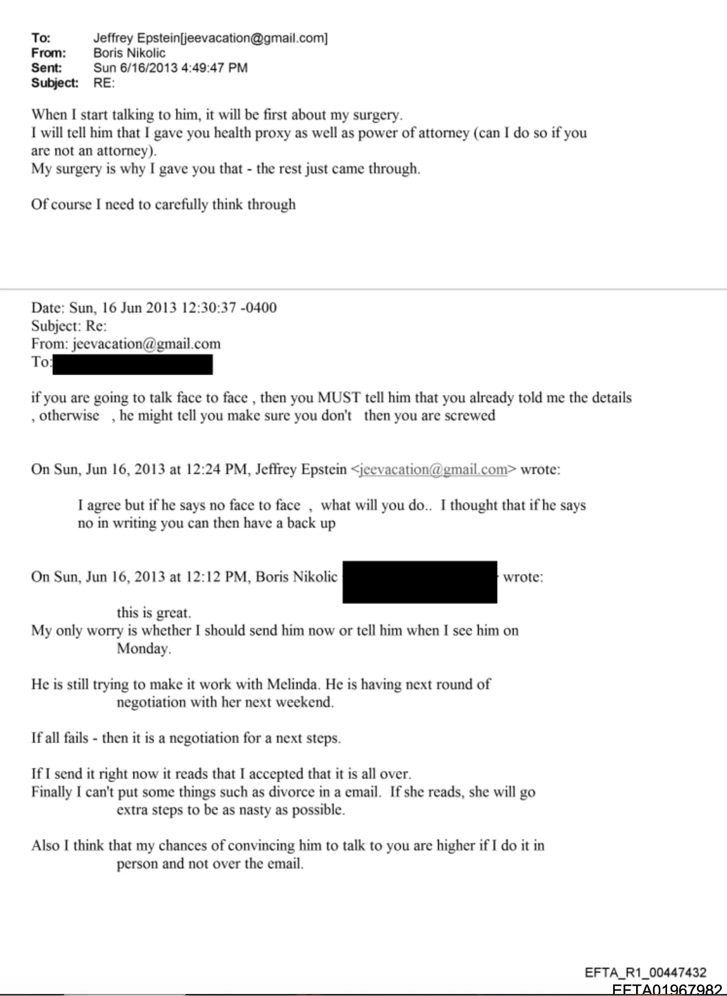 16. Juni 2013 – Epstein verfasste einen Brief im Namen von Boris Nikolic, der an Gates gesendet werden sollte, als stamme er von Boris. Der Brief enthielt eine falsche rechtliche Behauptung – dass Boris’ Kommunikation mit Epstein „vertraulich“ sei (Epstein war kein Rechtsanwalt) – und stellte Epstein als Boris’ bevollmächtigten Vertreter vor. Die dazugehörige Anweisung lautete: „Wenn du dich persönlich mit ihm unterhältst, MUSST du ihm sagen, dass du mir die Details bereits mitgeteilt hast, sonst könnte er dir sagen, dass du das auf keinen Fall tun sollst – dann bist du am Arsch.“ Epstein wies Boris an, Gates die Möglichkeit zu nehmen, seinen Zugang einzuschränken, bevor dieser überhaupt festgelegt war. Boris’ Reaktion: „Das ist großartig.“ (EFTA01967982)