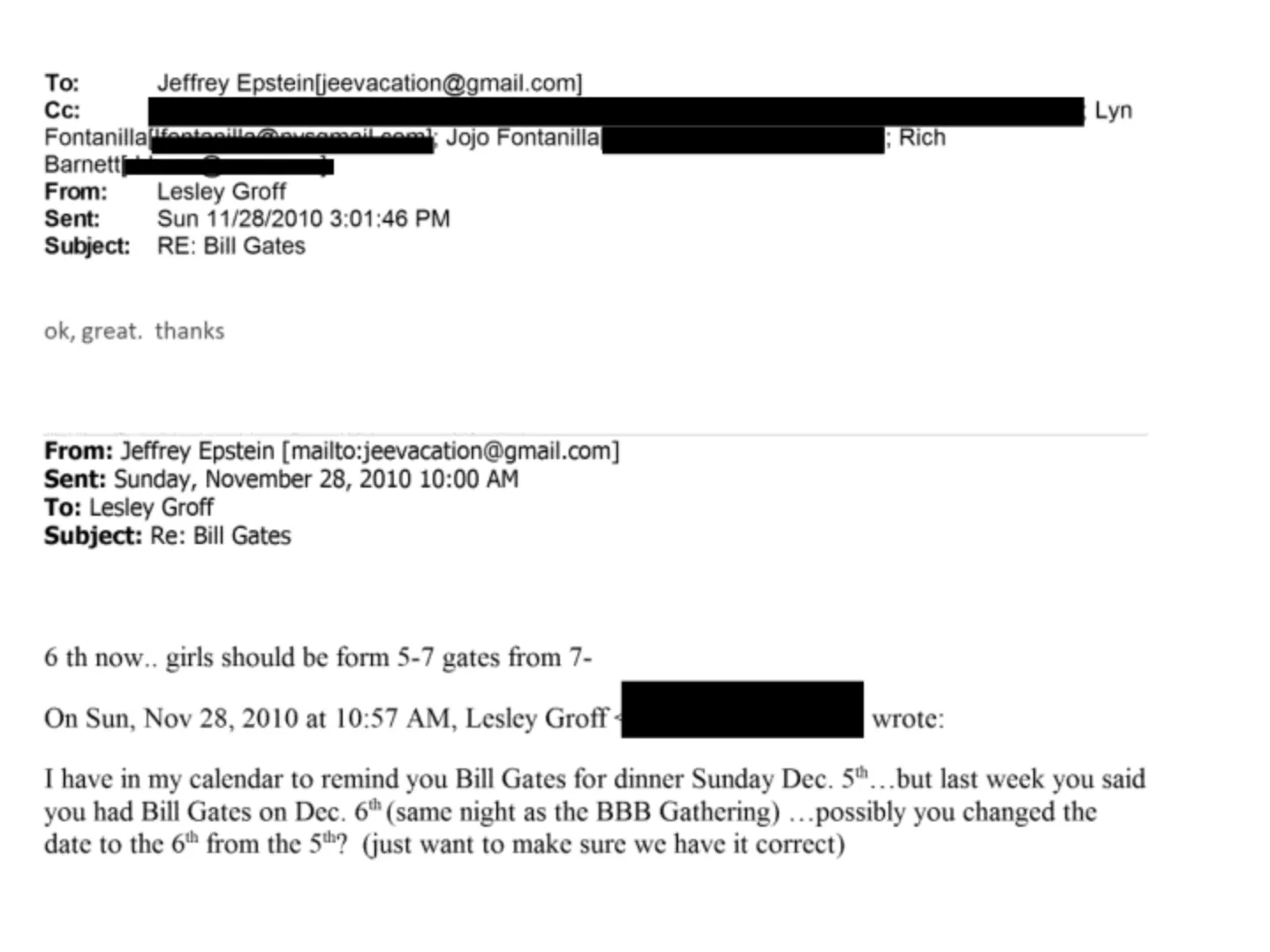 6. Dezember 2010 – Zwei Jahre nach Epsteins Verurteilung. Groff erhält eine Terminnotiz: „Mädchen von 5–7, Gates ab 7–.“ (EFTA_R1_01477257). Die Frau, die diese Termine verwaltete, sagt am Tag vor Gates aus.