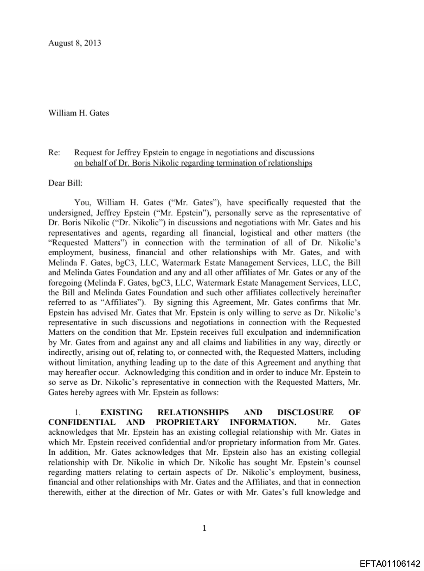 8. August 2013 – Fünfunddreißig Tage nach der Bestandsaufnahme der Druckmittel, fünf Monate nach dem Flug nach Palm Beach, unterzeichnet Gates in den bgC3-Büros in Kirkland, Washington, eine sechsseitige rechtliche Vereinbarung. In der Vereinbarung heißt es, Gates habe Epsteins Rolle „ausdrücklich angefordert“. Die Bedingungen: