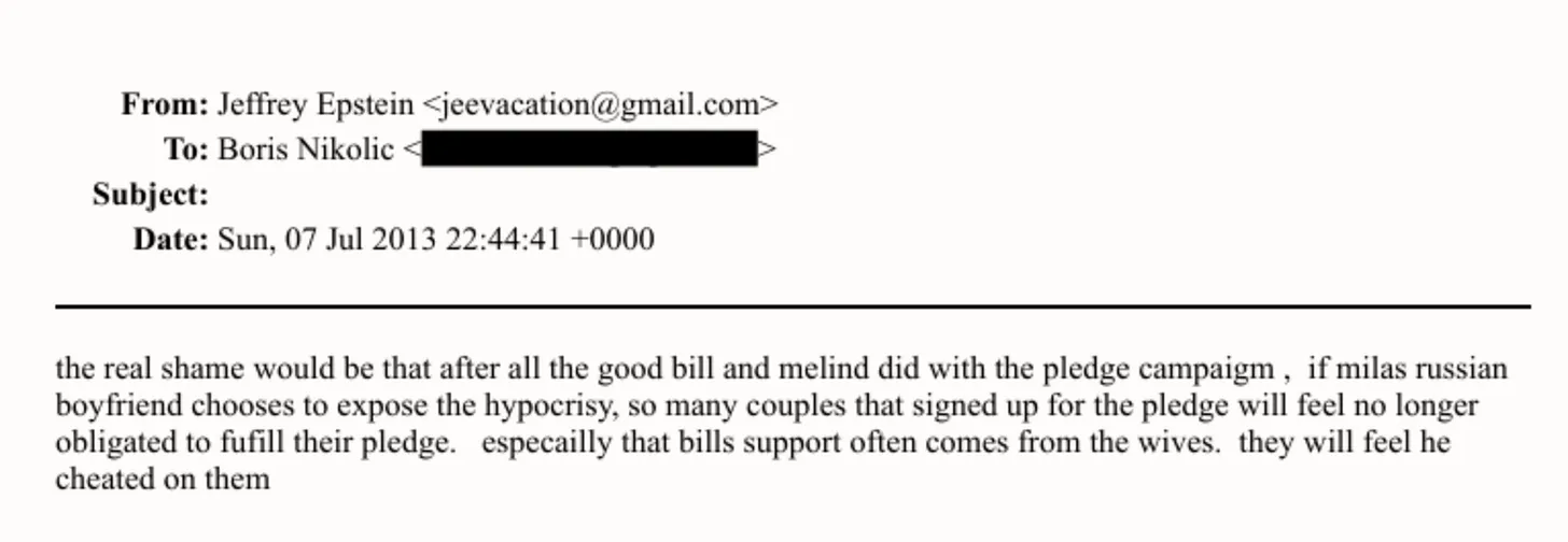Drei Tage später übermittelte Epstein die Drohung schriftlich direkt an Nikolic: „Das wirklich Schlimme wäre, dass nach all dem Guten, das Bill und Melinda mit der Spendenkampagne bewirkt haben, so viele Paare, die sich für die Spendenaktion angemeldet haben, sich nicht mehr verpflichtet fühlen würden, ihr Versprechen einzuhalten, sollte Milas russischer Freund beschließen, diese Heuchelei aufzudecken.“ (EFTA00964802)