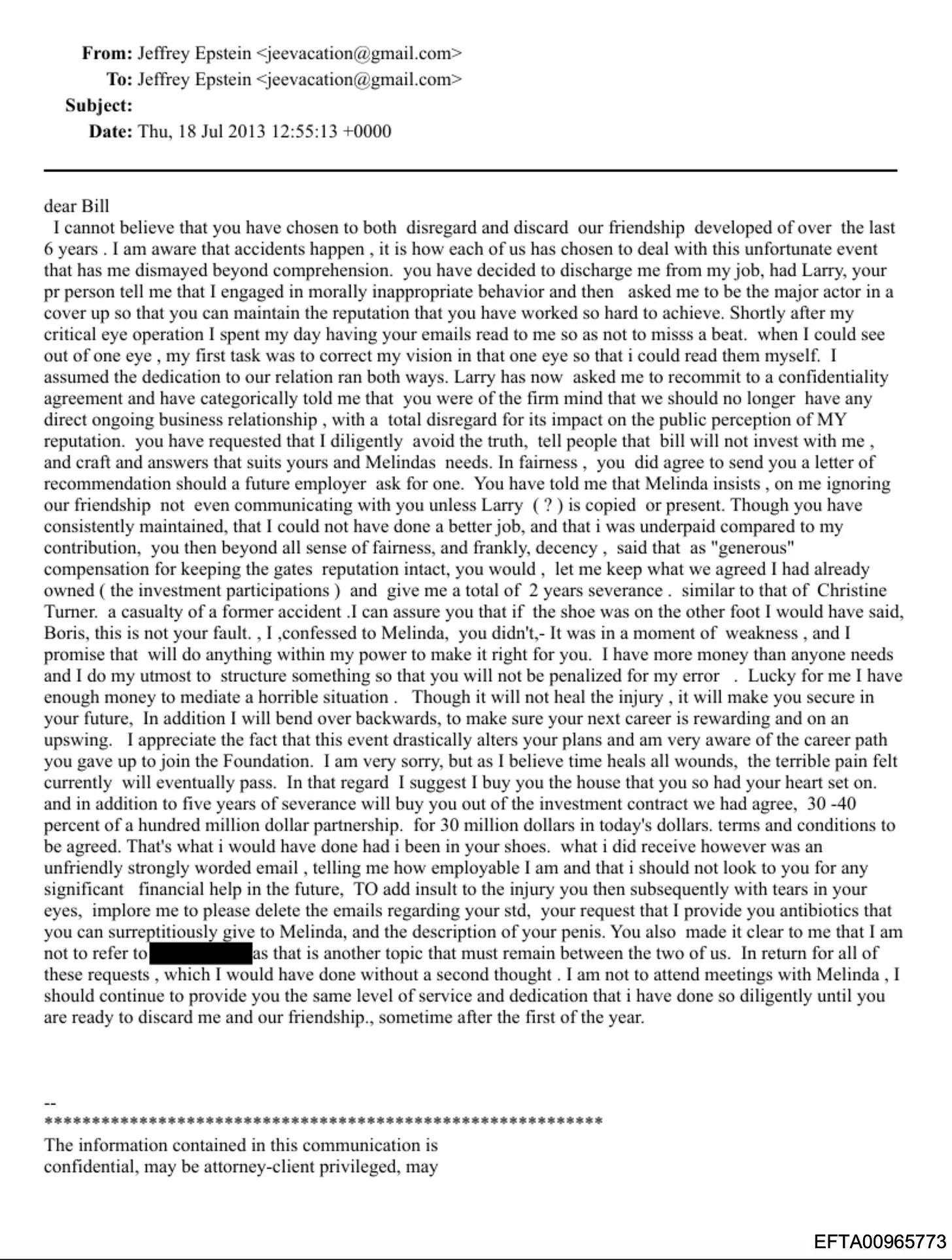 18. Juli 2013 – Epstein verfasst vorbereitendes Material – in Boris’ Tonfall, an sich selbst gesendet –, in dem behauptet wird, Gates habe Boris gebeten, E-Mails zu löschen, die sich auf eine sexuell übertragbare Krankheit, auf die Bitte an Boris, Antibiotika zu besorgen, die Gates Melinda ohne deren Wissen verabreichen könne, sowie auf die Beschreibung seines Penis beziehen. Im Entwurf heißt es weiter, Gates habe Boris gebeten, sich an „einer Vertuschung zu beteiligen, damit du den Ruf bewahren kannst, den du dir so hart erarbeitet hast.“ (EFTA00965773)