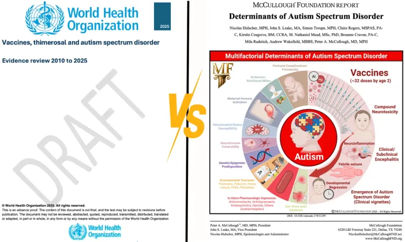 Vergleicht man jedoch dieses neue WHO-Dokument mit dem Bericht „Determinants of Autism Spectrum Disorder“ der McCullough Foundation – einer rigorosen, umfassenden Synthese aus 308 Studien zu Epidemiologie, mechanistischer Biologie, Toxikologie, Umweltbelastungen und klinischen Mustern – wird unübersehbar klar, dass die WHO zu ihrer Schlussfolgerung nicht gelangt, indem sie etwas widerlegt, sondern indem sie sich weigert, die Mehrheit der tatsächlich relevanten Beweise zu prüfen.