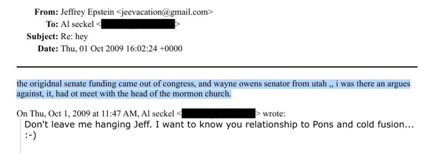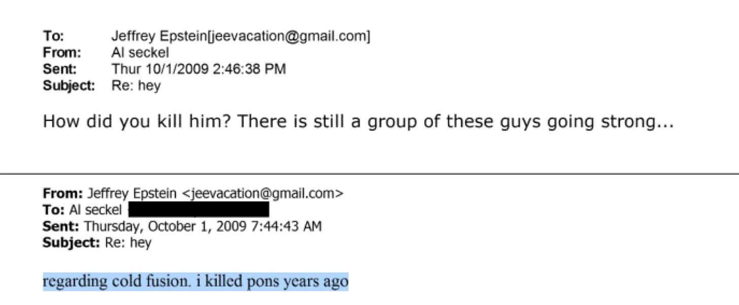 Ein bisher nicht berichteter E‑Mail‑Austausch in der veröffentlichten Bundes‑Epstein‑Akte zeigt, wie Jeffrey Epstein persönlich damit prahlt, Stanley Pons’ Kalte‑Fusion‑Forschung beendet zu haben – und beschreibt den konkreten politischen Mechanismus, mit dem er es getan haben will.