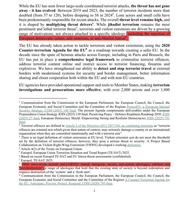 Die Europäische Kommission veröffentlicht einen neuen Plan zur Verhinderung von „Terrorismus“, der die Ablehnung europäischer demokratischer Werte, Anti-LGBTQ+-Hass, Frauenfeindlichkeit, systemfeindliche Ideologien und Nihilismus als „wachsende Bandbreite an Motiven“ einschließt.