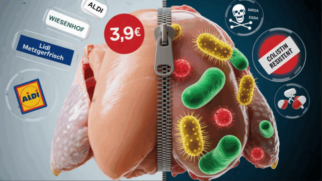 GEFÄHRLICH! Kaufen Sie DIESES Hähnchen NICHT mehr 9.600 Menschen sterben jährlich in Deutschland an antibiotikaresistenten Keimen. Jedes zweite Hähnchen aus dem Discounter trägt diese Bakterien. 🦠 Die Fakten (Quellen: VIER PFOTEN, Albert Schweitzer Stiftung, Deutsche Umwelthilfe 2024/2025):