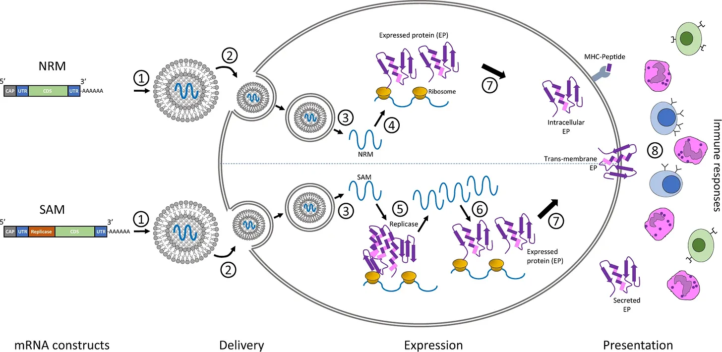 Mit anderen Worten: Nach der Injektion produziert der Körper sowohl das COVID-Spike-Protein als auch ein Enzym, das weitere Kopien der sa-mRNA herstellt.