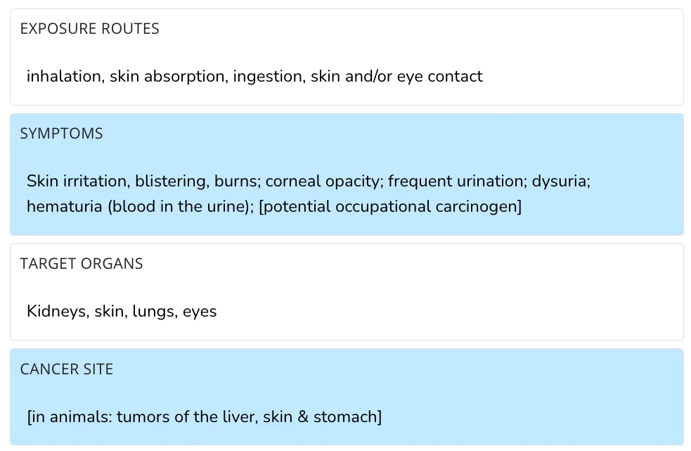 Es handelt sich um ein bekanntes Karzinogen, das bei mehreren Tierarten Tumore hervorruft und von US-Behörden offiziell als mögliches Humankarzinogen der Gruppe 2B und in Europa als vermutetes Humankarzinogen der Gruppe 1B eingestuft wird.