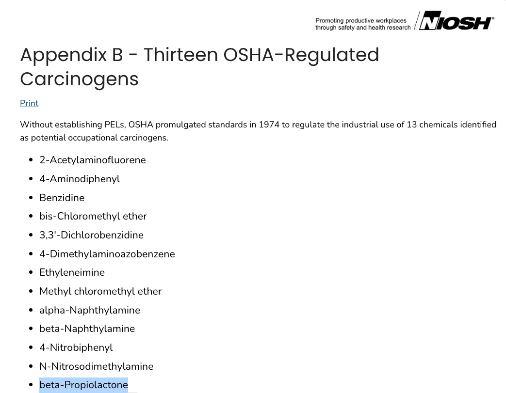 Die Arbeitsschutzbehörde (OSHA) des US-Arbeitsministeriums bestätigt (hier), dass BPL „als potenzielles Karzinogen am Arbeitsplatz identifiziert wurde“.
