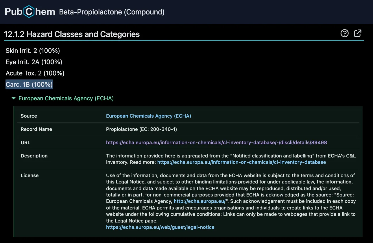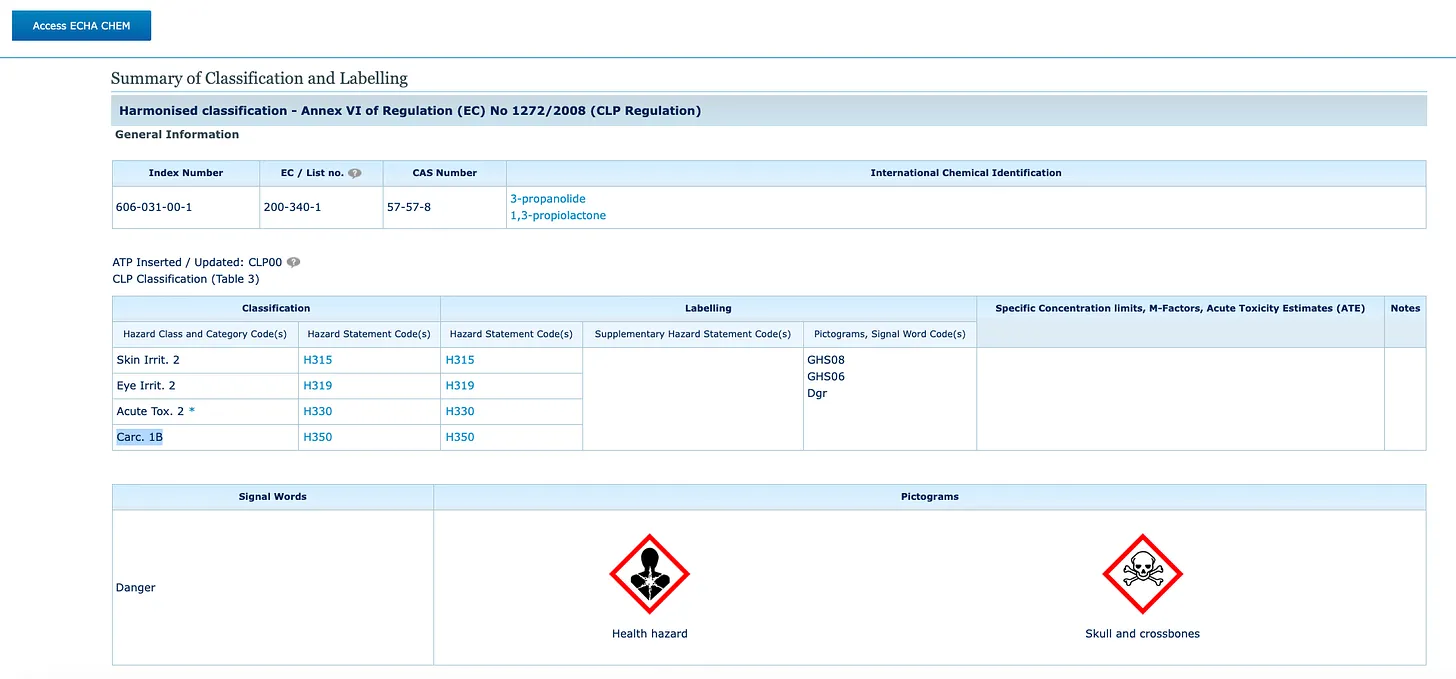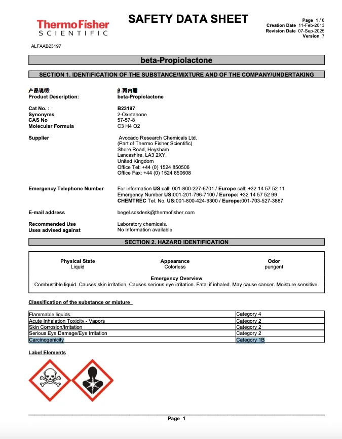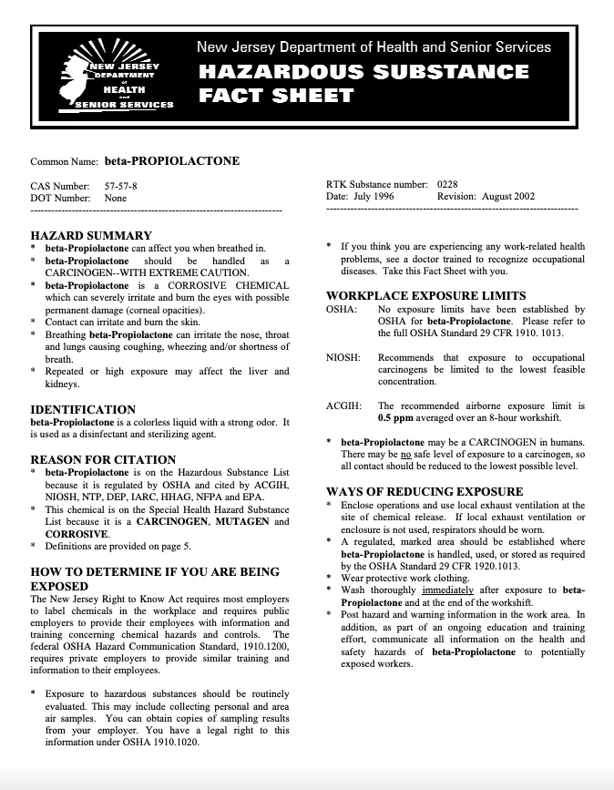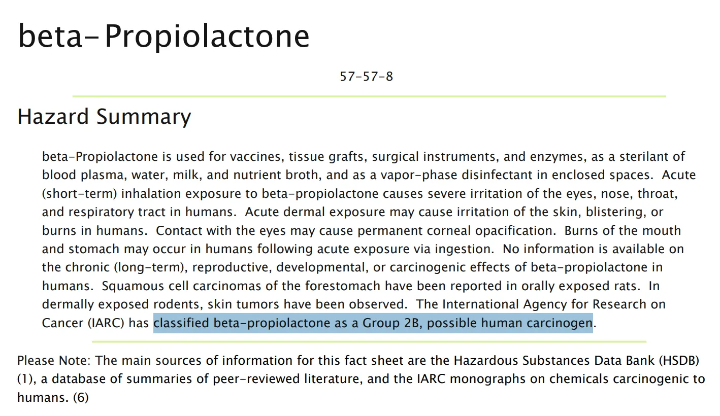 Beta-Propiolacton wird von den US-Behörden als Karzinogen der Gruppe 2B eingestuft und in Europa als Karzinogen der Gruppe 1B.