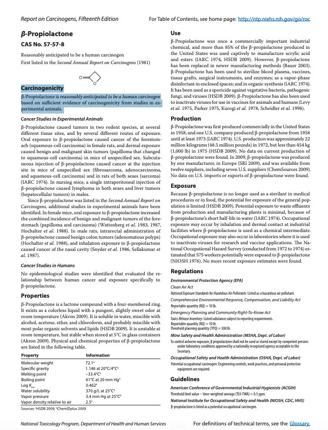 Das Nationale Toxikologieprogramm (NTP) des US-Gesundheitsministeriums (HHS) bestätigt ebenfalls, dass BPL „aufgrund ausreichender Hinweise auf Karzinogenität aus Studien an Versuchstieren vernünftigerweise als krebserregend für den Menschen anzusehen ist“.