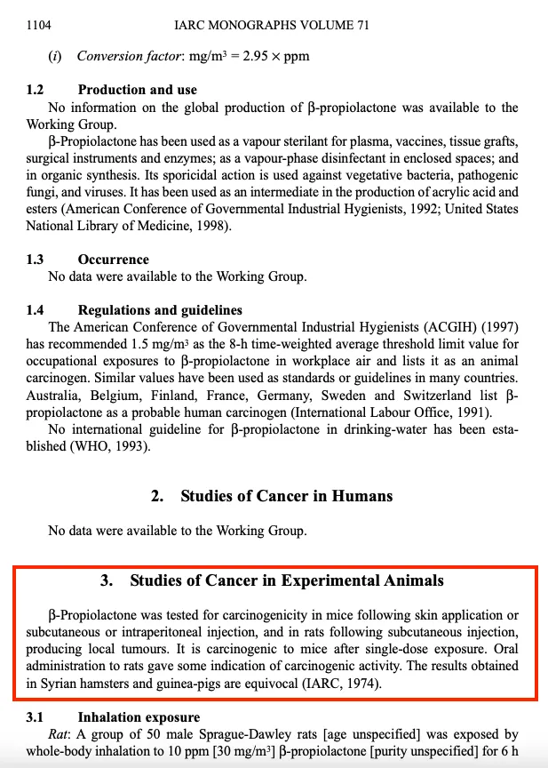 Laut IARC-Dokumenten „wurde β-Propiolacton auf Karzinogenität bei Mäusen nach Hautapplikation oder subkutaner oder intraperitonealer Injektion und bei Ratten nach subkutaner Injektion getestet, wobei lokale Tumore auftraten. Es ist nach einmaliger Exposition für Mäuse karzinogen. Die orale Verabreichung an Ratten ergab Hinweise auf karzinogene Aktivität. Die bei syrischen Hamstern und Meerschweinchen erzielten Ergebnisse sind nicht eindeutig (IARC, 1974).“