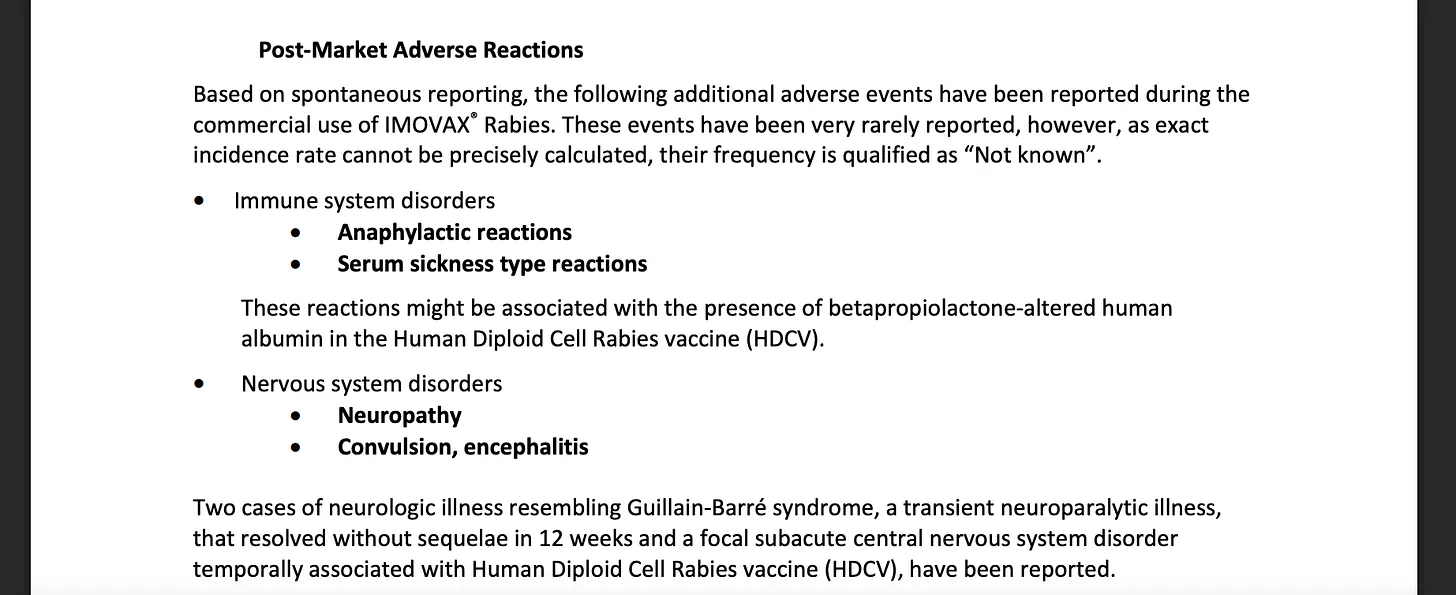 Informationsblätter der kanadischen Regierung zu Imovax bestätigen, dass Störungen des Immunsystems im Zusammenhang mit dem Impfstoff „möglicherweise mit dem Vorhandensein von durch Betapropiolacton verändertem Humanalbumin im Human Diploid Cell Rabies-Impfstoff (HDCV) zusammenhängen könnten”.