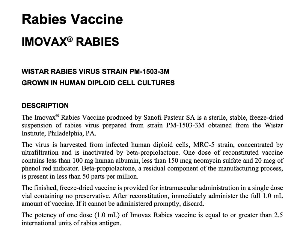 „Der von Sanofi Pasteur SA hergestellte Imovax®-Tollwutimpfstoff ist eine sterile, stabile, gefriergetrocknete Suspension des Tollwutvirus, die aus dem Stamm PM-1503-3M des Wistar Institute in Philadelphia, PA, hergestellt wurde“, heißt es in der Packungsbeilage.