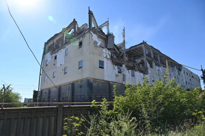 Ein Beispiel für die Unternehmensrisiken in der Ukraine: Ein Pressehaus in Charkiw, bestehend aus einer Druckerei, Redaktionsbüros und Geschäften, nachdem es am 31. Juli 2022 durch einen Raketenangriff beschädigt wurde.