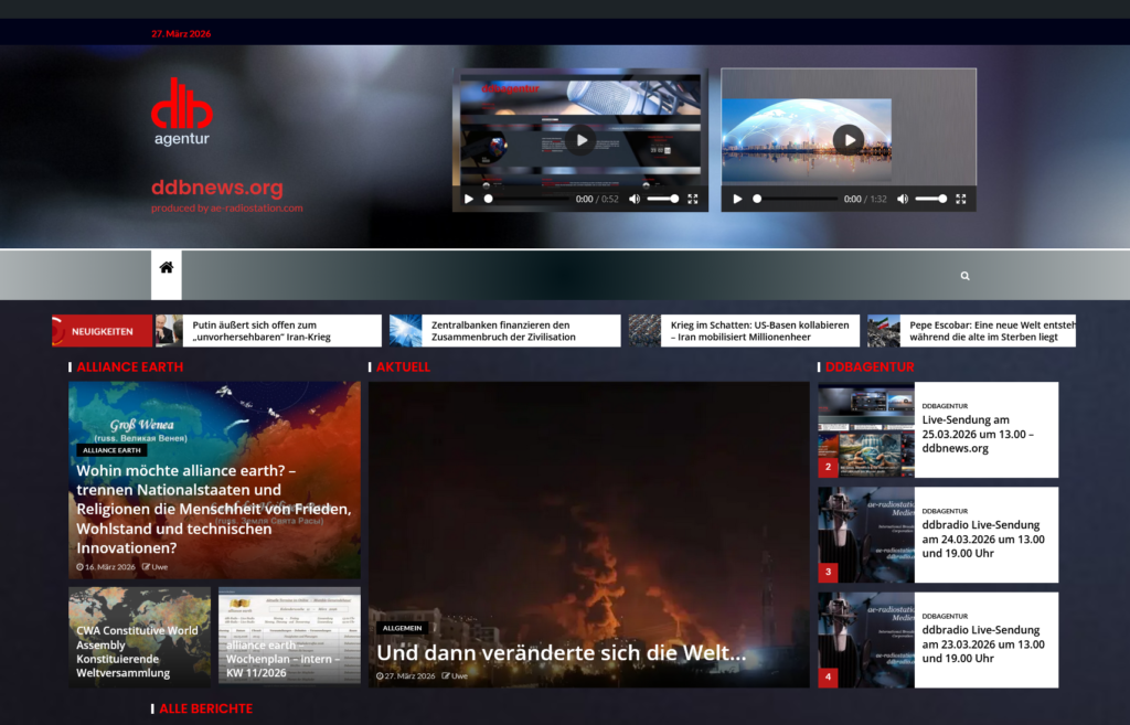ddbagentur Live-Sendung am 27.03.2026 um 13.00 – ddbnews.org Uwe 27. März 2026 1 min read Hier können Sie die Sendung hören: 1) über unser Studio 1 https://www.ddbradio.org/ Continue Reading Previous ddbradio Live-Sendung am 26.03.2026 um 13.00 und 19.00 UhrNext VOM SCHÖPFER ZUM SKLAVEN: WIE DIE MENSCHEN IHR LEBEN VERLOREN!