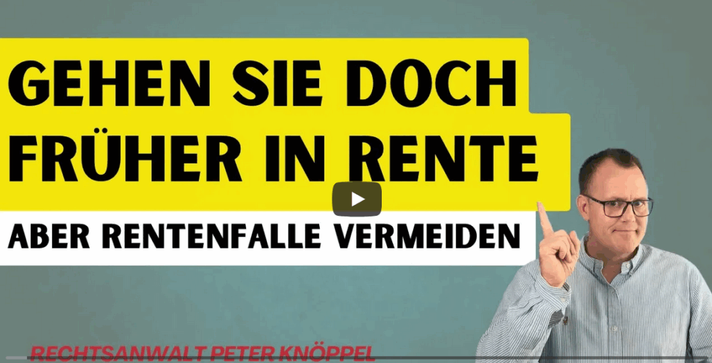 Gehen Sie doch einfach früher in Rente- was hindert Sie daran? Warum sich die frühere Rente trotz Abschlägen lohnen kann! Dabei falsche Annahmen vermeiden und nicht in Rentenfalle tappen. Viele Versicherte verlassen sich bei der Planung ihrer Rente auf die Angaben der Renteninformation – und tappen damit in eine böse Rentenfalle. In diesem Video zeigt Ihnen Rechtsanwalt und Rentenberater Peter Knöppel anhand eines realitätsnahen Beispiels, welcher Denkfehler Sie mehrere Hundert Euro pro Monat kosten kann und wie Sie ihn sicher vermeiden.