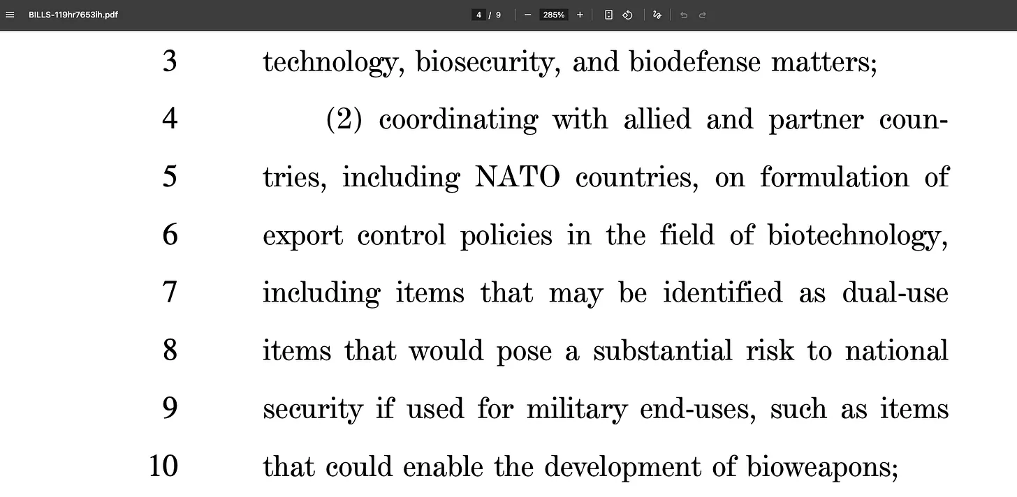 Der Gesetzentwurf verbindet seine Bestimmungen zur Biotechnologie direkt mit Technologien, die zur Herstellung biologischer Waffen genutzt werden können.