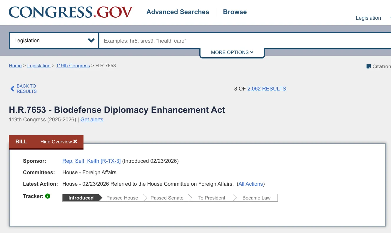 Der Gesetzentwurf H.R. 7653 mit dem Titel „Biodefense Diplomacy Enhancement Act” (Gesetz zur Verbesserung der Biodefense-Diplomatie) wurde letzte Woche vom US-Abgeordneten Keith Self (R-TX) eingebracht und an den Ausschuss für auswärtige Angelegenheiten des Repräsentantenhauses verwiesen.