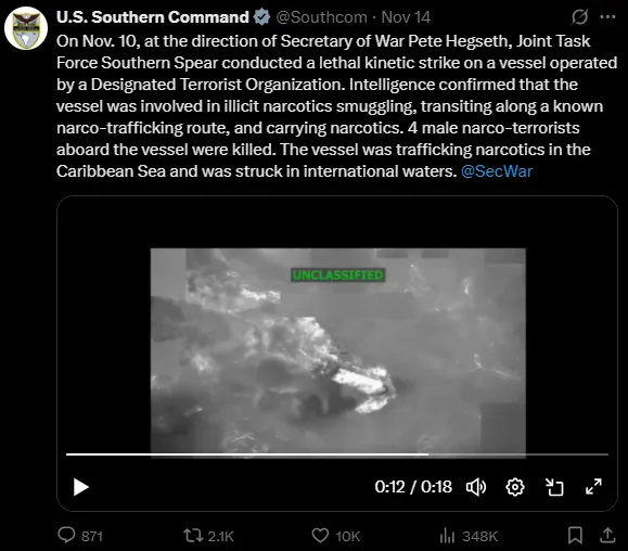 Antiwar.com berichtete: „Hegseths Ankündigung erfolgte, als US-Beamte bekannt gaben, dass die USA am Montag ein weiteres mutmaßliches Drogenboot in der Region bombardiert hatten. Dies war der 20. Angriff und das 21. Boot, das das US-Militär seit Beginn der Kampagne Anfang September gesprengt hat. Die Beamten sagten, dass bei dem jüngsten Angriff vier „Narkoterroristen“ getötet wurden, ein Begriff, den die Trump-Regierung verwendet, um die außergerichtlichen Hinrichtungen auf See zu rechtfertigen.“