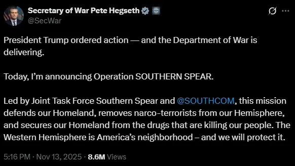 Kurz nachdem Hegseth die neuen Schilder angebracht hatte, gab der Kriegsminister bekannt, dass die Vereinigten Staaten offenbar kurz vor einer Invasion Venezuelas stehen, und kündigte einen neuen Plan an: die Operation Southern Spear. Hegseth sagte, das Ziel sei es, den „Drogenterrorismus“ zu stoppen.