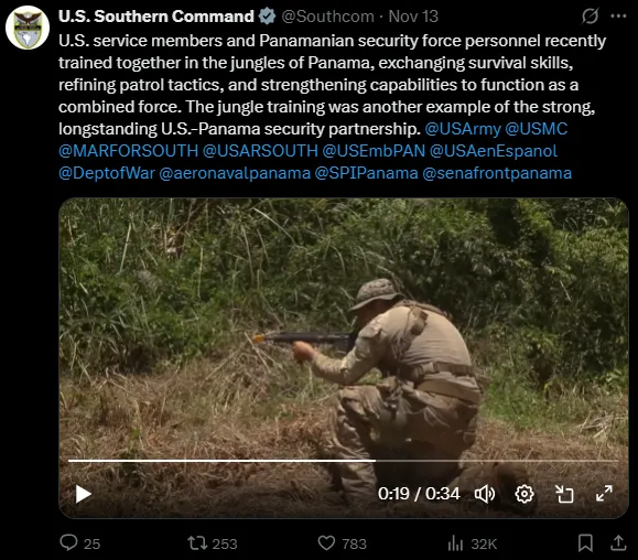 Panama teilte mit, dass vom 9. bis 29. Oktober etwa 50 US-Marinesoldaten in seinem Dschungel trainieren würden, um ihre Fähigkeiten „in einer der anspruchsvollsten Umgebungen“ zu verbessern, berichtete AFP im Oktober. „Dieses Training dient ausschließlich unserer Verteidigung und unserem Schutz“, um „organisierte Kriminalität und Drogenhandel“ zu bekämpfen, sagte der panamaische Major Didier Santamaria gegenüber AFP.