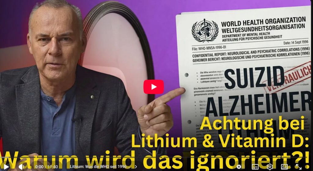 Schon 1996 hat die WHO in einem Grundsatzdokument zu Spurenelementen festgehalten, was seitdem durch Dutzende Studien weltweit bestätigt wurde: Minimale Mengen Lithium im Trinkwasser senken die Selbstmordrate um bis zu 7 %, reduzieren Alzheimer, Herzinfarkte und psychiatrische Einweisungen – und können das Fortschreiten von Mild Cognitive Impairment stoppen.