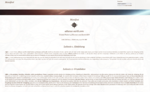 alliance earth United Nation of Human and Earth, besteht aus dem festen Glauben, daß die Seele, der Geist und der Körper jedes Wesens, sein Wissen und die daraus erwachsene Weisheit, unveräußerliches Eigentum der Schöpfung und des eigenen Lebens sind und sie ohne unsere ausdrückliche Zustimmung kein weltliches Recht einschränken kann und darf. alliance earth ist der Glaube an alle beseelten Wesen und ihre einzigartigen Fähigkeiten, an die Macht des Wissens, welches sie zur Weisheit vollenden können und die unauslöschlichen Rechte aus der Quelle der Schöpfung, die jedes einzelne Wesen seit seiner Entstehung in sich trägt.