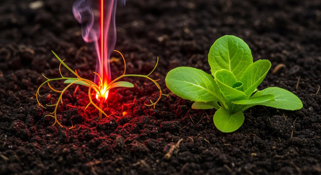 Wenn die KI das Unkraut erkennt, kennt sie keine Gnade. Mit 150-Watt-Lasern wird der Störenfried auf den Millimeter genau weggeschossen. Peng! Verbrannt in Millisekunden. Die Nutzpflanze daneben? Bleibt völlig unversehrt. Der Boden? Wird nicht umgepflügt und bleibt gesund.
