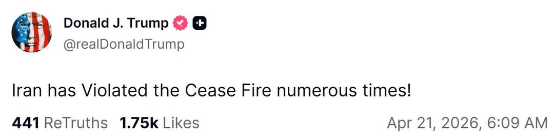 Er sagte, die Seeblockade sei „erfolgreich“ gewesen und die US-Streitkräfte hätten „die Kontrolle über die Meerenge“. Trump erklärte zudem, er wolle den Waffenstillstand nicht verlängern, da „nicht mehr viel Zeit bleibt“ – fügte jedoch hinzu, dass „der Iran sich mit einem Abkommen wieder auf eine solide Basis stellen kann“.