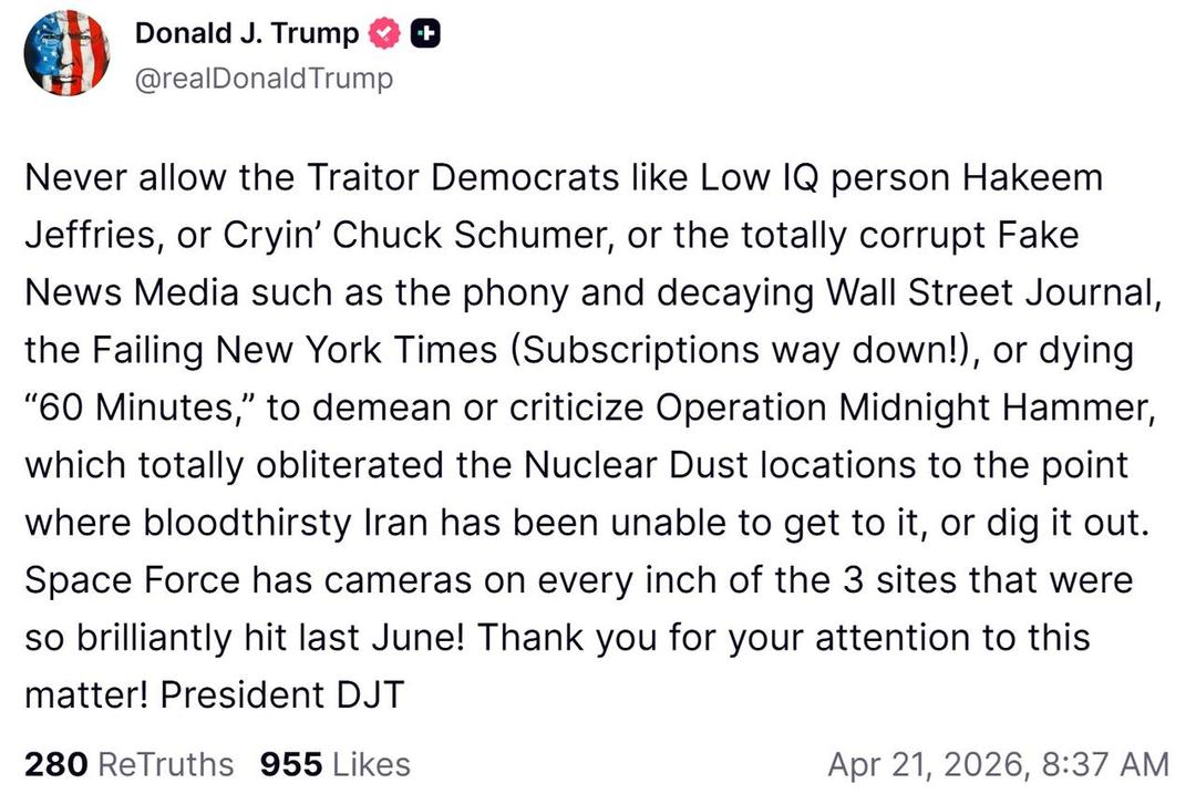 Er schloss sich dem oben Gesagten schnell mit der folgenden Botschaft an, in der er davon sprach, Irans „nuklearen Staub“ so weit „ausgelöscht“ zu haben, dass die Iraner keinen Zugriff mehr darauf haben: