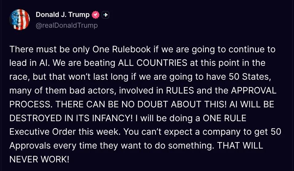 Im Juli stellte der Präsident den KI-Aktionsplan des Weißen Hauses vor, der die Pläne der Regierung für den Einsatz und die Implementierung von KI in scheinbar allen Bereichen des Lebens der Amerikaner darlegt. In seiner Rede vor Tech-Giganten und Finanzoligarchen sagte Trump, dass eine nationale Regulierung, die über die Gesetze der Bundesstaaten hinausgeht, bevorstehe.